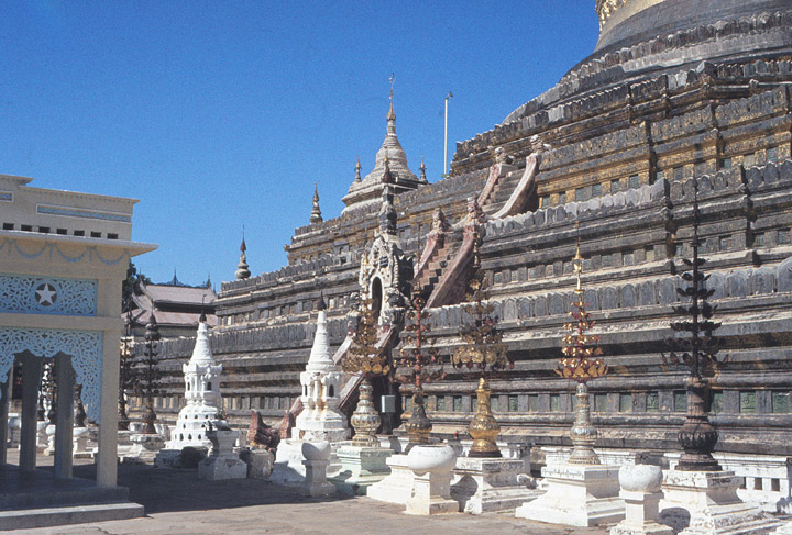 В послемонгольский, поздний период история Бирмы в течение нескольких столетий протекала в длительной междоусобной борьбе между различными народностями и феодальными княжествами. Столицами этих княжеств попеременно становились Ава, Пегу, Новый Проме, пока наконец в 1760 г. борьба не закончилась объединением государства под властью царя Аулатпая, основавшего новую династию. В 1857 г. столицей стал Мандалай. Для бирманского искусства послемонгольского периода характерны усиление народных, национальных элементов, сказавшихся в развитии народного прикладного искусства (резьба по дереву, резьба и живопись по лаку и т. п.), и применение его для убранства всех видов архитектурных сооружений. В этот период продолжают строиться также буддийские храмы, особенно ступы, не представляющие в отношении развития или конструкции ничего принципиально нового по сравнению с зодчеством паганского периода, но отличающиеся нередко, особенно в 18 в., огромными размерами. Эти ступы зачастую сооружались над старыми, как бы включая их в себя или нарастая вокруг них. Таковы почти все существующие поныне грандиозные ступы Мандалая и Рангуна. Среди них знаменит своими размерами и необыкновенным богатством декоративного убранства Шве-да-гон в Рангуне. В настоящем своем виде это одно из самых высоких и грандиозных архитектурных сооружений Азии (высота 107 м). Оно занимает площадь 70000 кв. м. Четыре ориентированные по странам света лестницы ведут к ограде. Наиболее великолепная из них, южная, украшена гигантскими (18 м в высоту) фигурами крылатых львов. Ряд ворот, обрамленных изображениями сплетающихся многоглавых змей, и галлерей из покрытого лаком и резьбой дерева ведут к основанию пагоды, имеющей 500 м в обхвате. Сложно профилированный восьмигранный базис поддерживает колоколообразный массив, покрытый позолотой и увенчанный драгоценным навершием — хти. Здесь, так же как и во всей архитектуре 16—18 вв., большое значение имеет ее красочное оформление. Как правило, наружные и внутренние части многочисленных деревянных построек («залов посвящения», монастырей, дворцов и т. д.) богато украшены резьбой и скульптурой, ярко раскрашены и позолочены. Для средневековой художественной культуры Бирмы характерно активное взаимодействие с искусством соседних стран. Однако, испытав влияние Индии и Китая, архитектура и искусство Бирмы выработали совершенно своеобразные черты и, воплотив эстетические воззрения народа, заняли свое определенное место в истории художественной культуры Юго-Восточной Азии. Н.Дьяконова