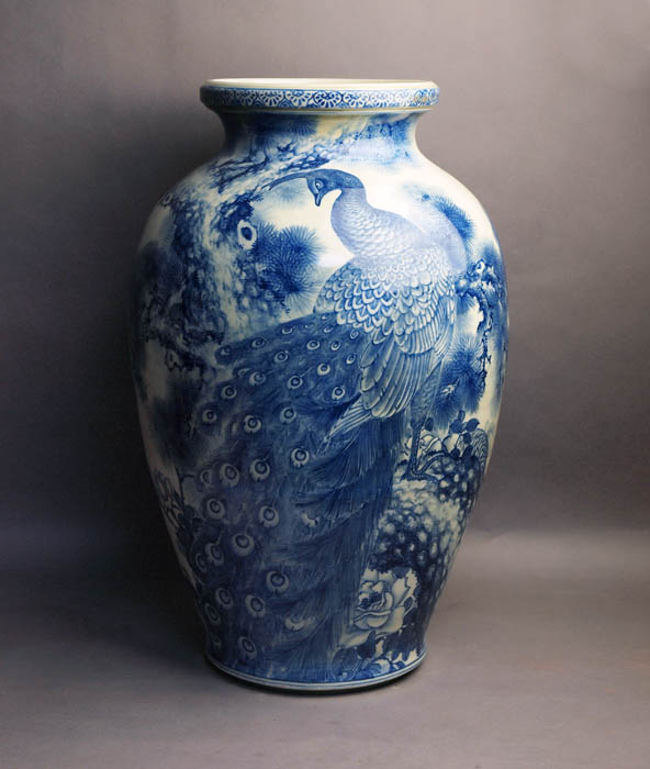 Большая ваза с изображением павлина. Прекрасный декоративный предмет интерьера в японском стиле. Начало XX века Японская керамика